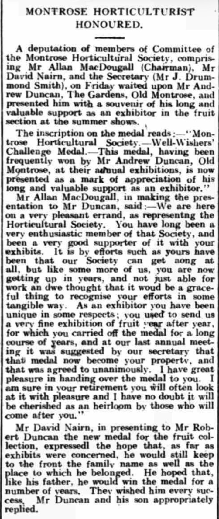The inscription read “Montrose Horticultural Society. Well-Wishers’ Challenge Medal. This medal, having been frequently won by Mr Andrew Duncan, Old Montrose, at their annual exhibitions, is now presented as a mark of appreciation of his long and valuable support as an exhibitor.”
