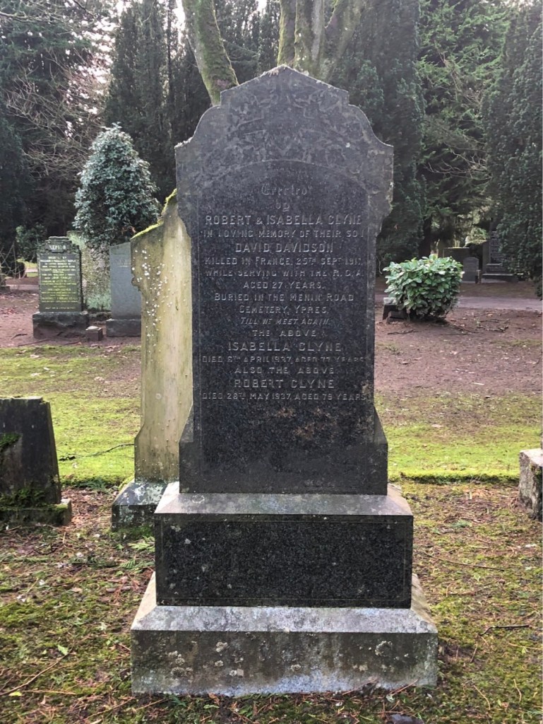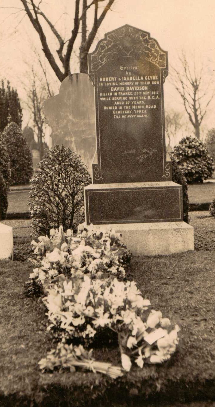 Although Dave was buried at Ieper, his parents erected a headstone at Sleepyhillock, Montrose in his memory.
