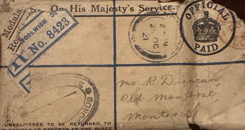 Very recently however I came across additional information to help narrow my search. Firstly I found an article from the Montrose Review where he was denied exemption from service in Dec 1917. Then, the crucial piece was finding his dog tags with his service number imprinted and then, stored carefully in the original envelope, I found his medals.