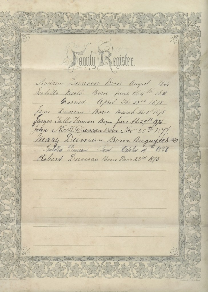 The Family Bible records Andrew and Isabella’s marriage and the births of their 6 children :